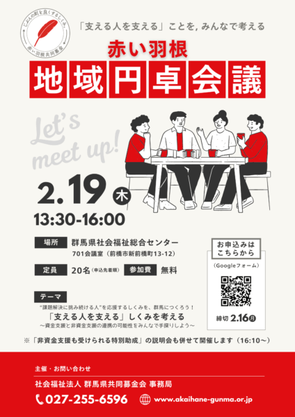 地域社会において多様な主体が連携することを目指して、テーマ(課題)を共有し、アイデアと知見を持ち寄り、ネットワークを構築するための対話の場「地域円卓会議」を、群馬県共同募金会として初めて開催します。